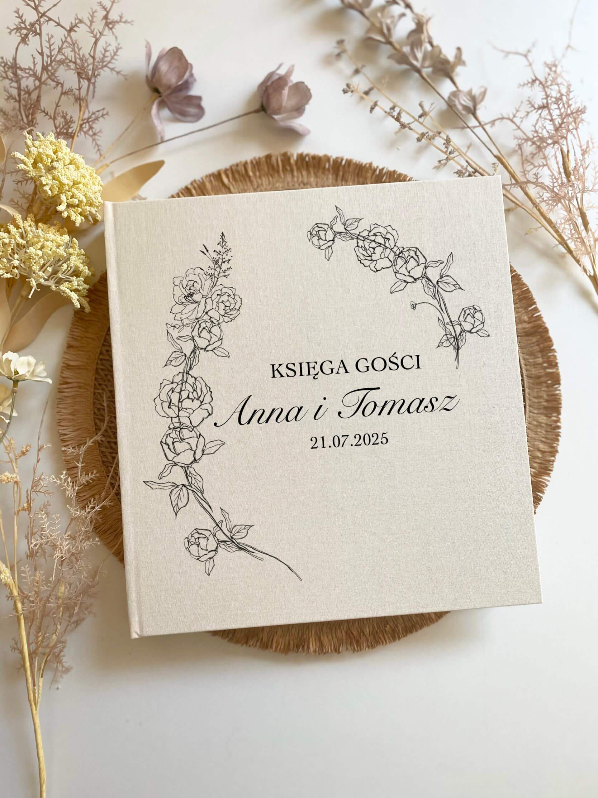 Szukasz wyjątkowej Księgi Gości na wesele, która będzie nie tylko elegancka, ale i może stać się albumem? Przedstawiamy elegancką i wszechstronną lnianą Księgę Gości, idealną na każdą wyjątkową okazję. Ta pięknie wykonana księga to nie tylko miejsce na wpisy gości, ale również wspaniały album, w którym można przechowywać zdjęcia i wspomnienia z racji grubych białych kart. Możliwość personalizacji napisu i daty ślubu i wesela – dodaje jej wyjątkowości.