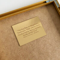 Złota, błyszcząca grafika drukowana na papierze o gramaturze 225 gram, z personalizowanym napisem.