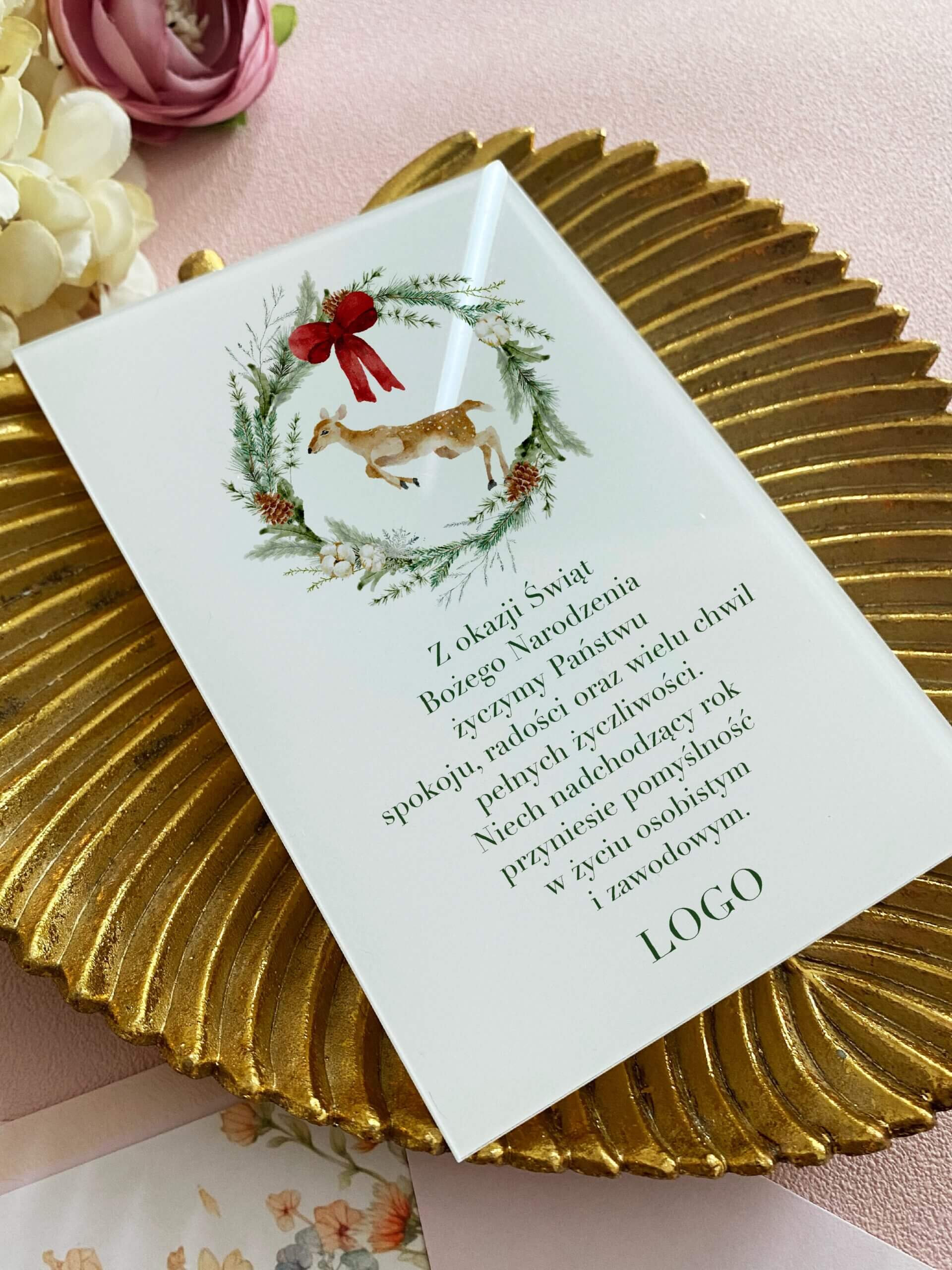 Eleganckie kartki świąteczne firmowe wysyłane do kontrahentów to wizytówka firmy. U nas znajdziesz wspaniałe i niebanalne rozwiązania, które wyróżniają się na tle „wszystkich innych” kartek firmowych. Akrylowe kartki świąteczne dla firm z minimalistyczną grafiką i kopertą i opcjonalnie lakiem w kolorze do wyboru, to wspaniały akcent w relacjach biznesowych.