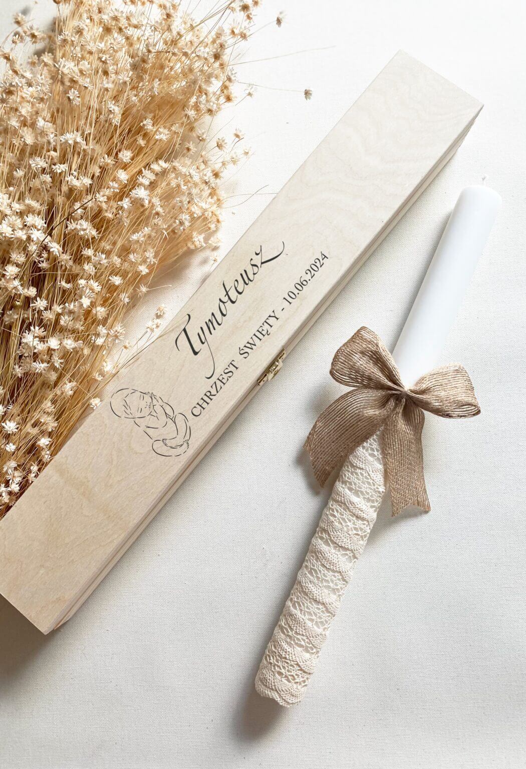 Szukasz wyjątkowego, drewnianego pudełka na szatkę na Chrzest maluszka, które będzie nie tylko zabezpieczać szatkę, ale pełnić funkcję sentymentalną i dekoracyjną? Znajdziesz je u nas! Elegancki, minimalistyczny napis na drewnianym pudełku sprawi, że będzie to produkt wyjątkowy.